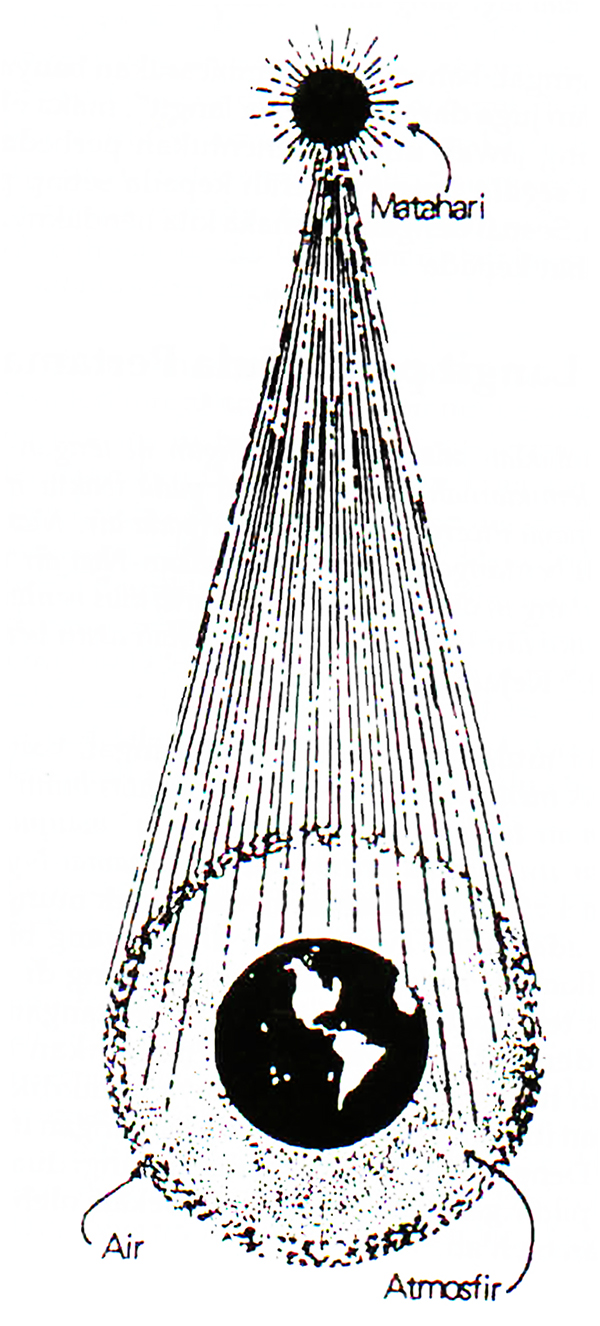Oleh karena baik bentangan itu maupun air adalah jernih, dan air itu membentuk hanya suatu lapisan tipis yang mengelilingi bentangan itu, maka cahaya-cahaya matahari yang bersinar ke atas bumi adalah sama cerahnya di waktu itu seperti juga di waktu ini. Dan juga, karena cahaya-cahaya matahari pada waktu itu menyentuh air sebelum semuanya itu didinginkan oleh melewati lapisan atmosfir yang berat, maka cahaya-cahaya itu adalah lebih panas sewaktu mereka mencapai air yang di atas bentangan daripada cahaya-cahaya itu di bawah bentangan apabila mereka mencapai bumi. Dengan disebarkan pertama sekali oleh air, maka sinar-sinar cahaya itu membuatnya menjadi panas, selanjutnya oleh beredar-edar mengelilingi bentangan itu, maka air yang panas itu menghangati bumi secara seimbang sama di mana-mana -- baik di kutub-kutub maupun di daerah-daerah khatulistiwa. Hanya sedikit terdapat perbedaan temperatur karena adanya terang pada siang hari dan karena tidak adanya terang pada malam hari. Kemudian akibatnya seperti halnya kini malam hari adalah lebih sejuk daripada siang hari. Tetapi karena keadaan ini tidak lagi terus berlaku sekarang, ternyata pada sesuatu masa suatu air bah telah menimbulkan